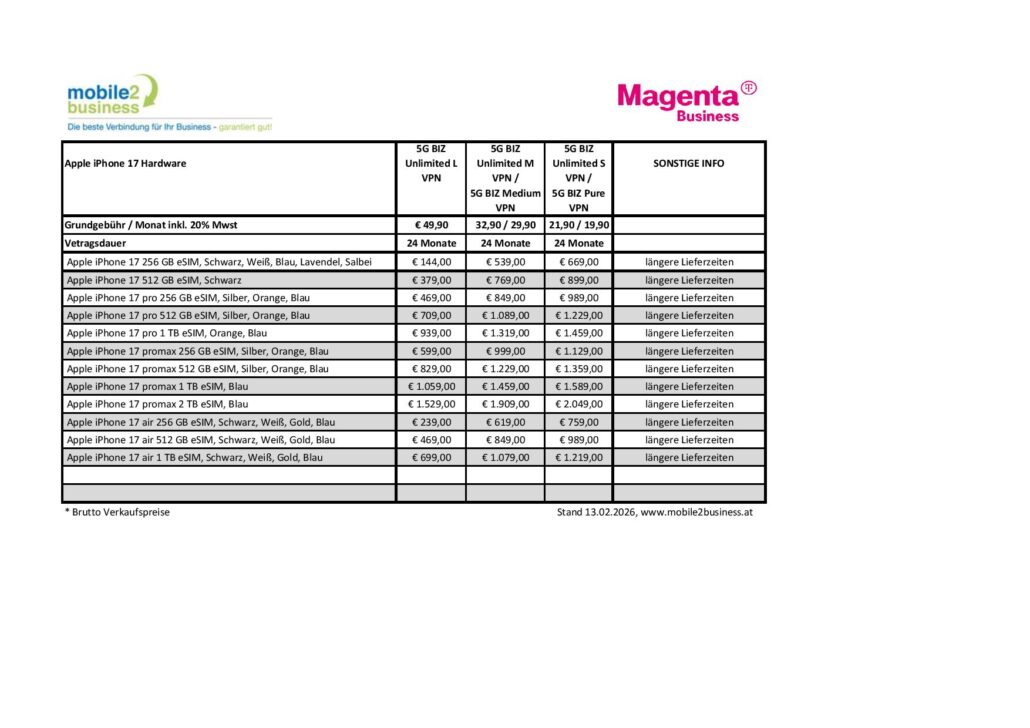 Unsere aktuelle „Apple iPhone“ Hardware Preisliste 12. Februar 2026/0 Kommentare/in News /von admin https://mobile2business.at/wp-content/uploads/2018/08/logo.jpg 0 0 admin https://mobile2business.at/wp-content/uploads/2018/08/logo.jpg admin2026-02-12 09:07:002026-02-12 15:22:15Unsere aktuelle „Apple iPhone“ Hardware Preisliste