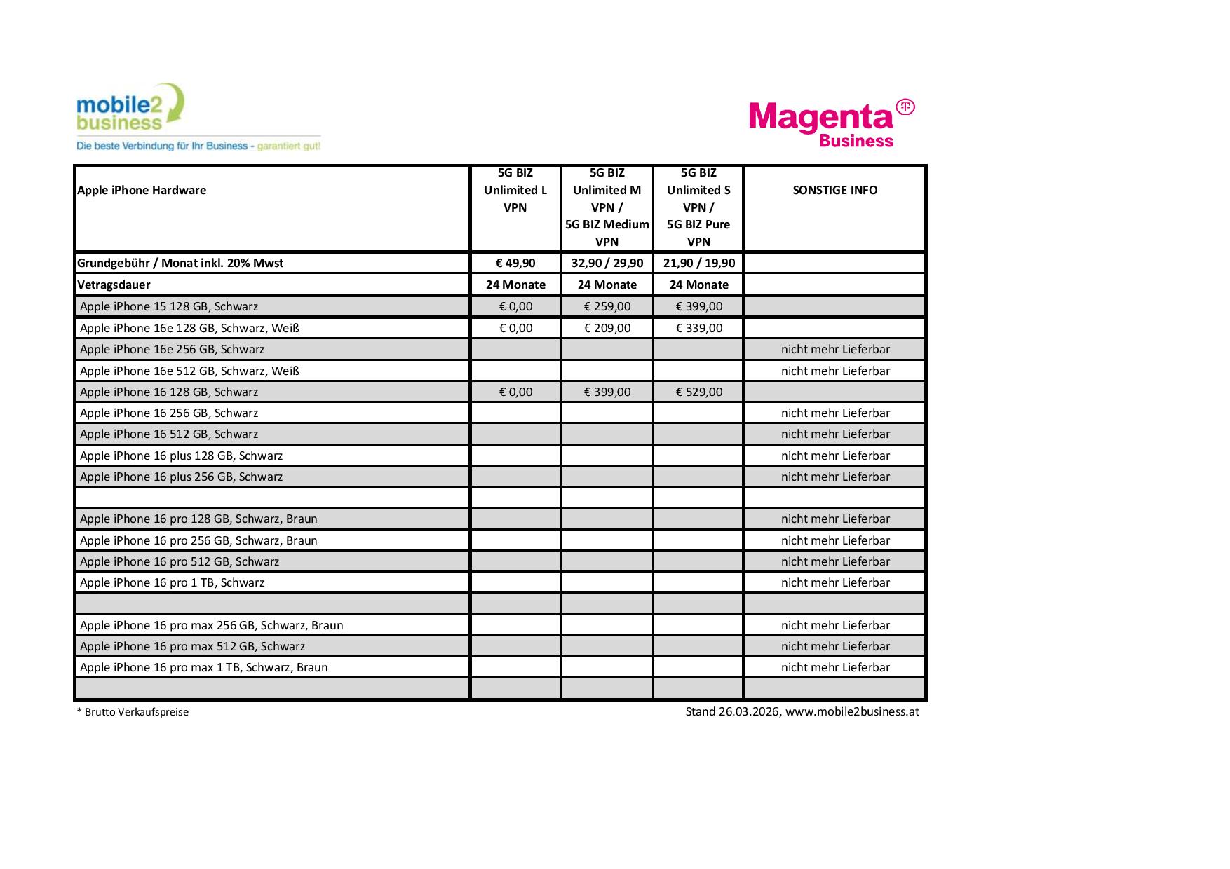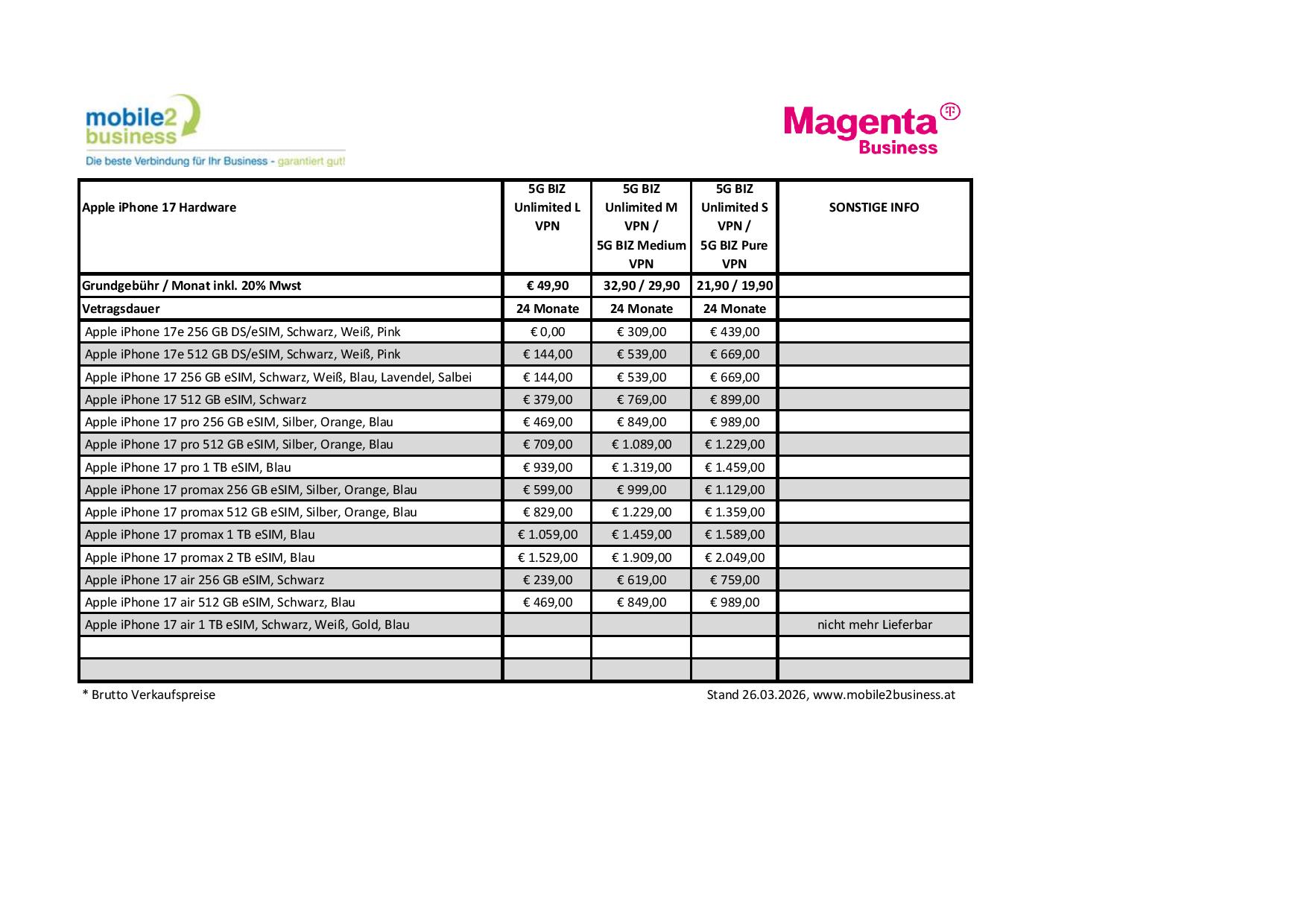 Unsere aktuelle „Apple iPhone“ Hardware Preisliste 26. März 2026/0 Kommentare/in News /von admin https://mobile2business.at/wp-content/uploads/2018/08/logo.jpg 0 0 admin https://mobile2business.at/wp-content/uploads/2018/08/logo.jpg admin2026-03-26 09:07:002026-03-26 14:21:25Unsere aktuelle „Apple iPhone“ Hardware Preisliste